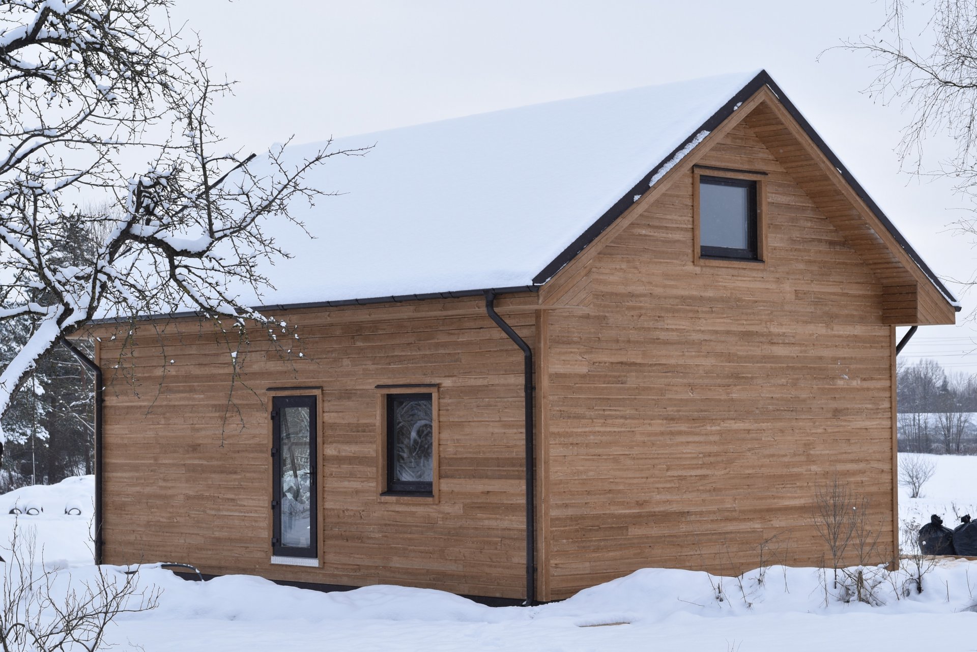 Mūsdienīga 60 m² māja ar plašu mansardu un praktisku, tīru fasādi — ideāla ģimenes ikdienai.