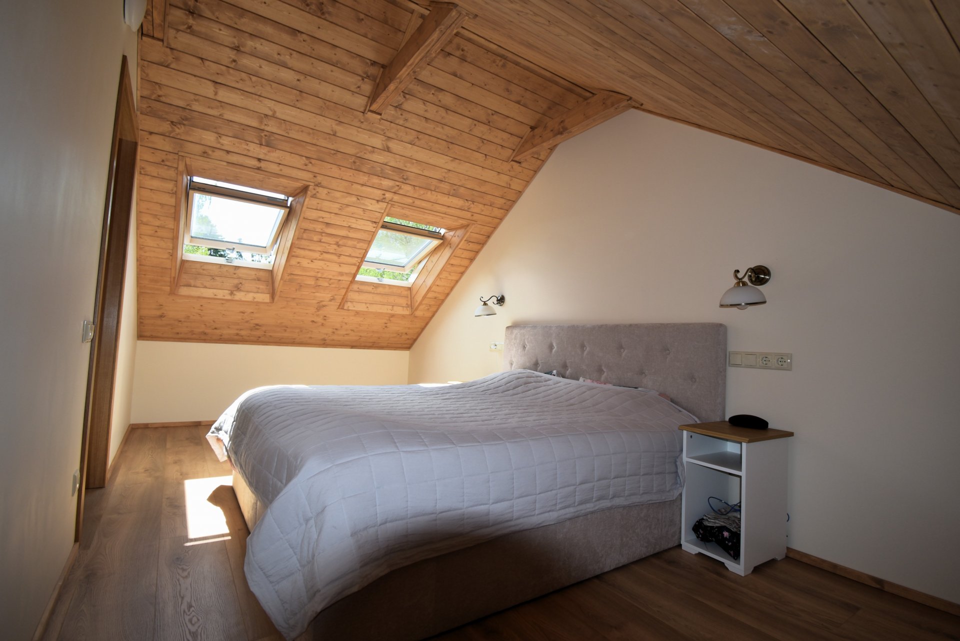 Kompakta dzīvojamā ēka ar apbūves laukumu 60 m², aptuveni iekšējo platību ~50m² plus apdzīvojamu mansardu.